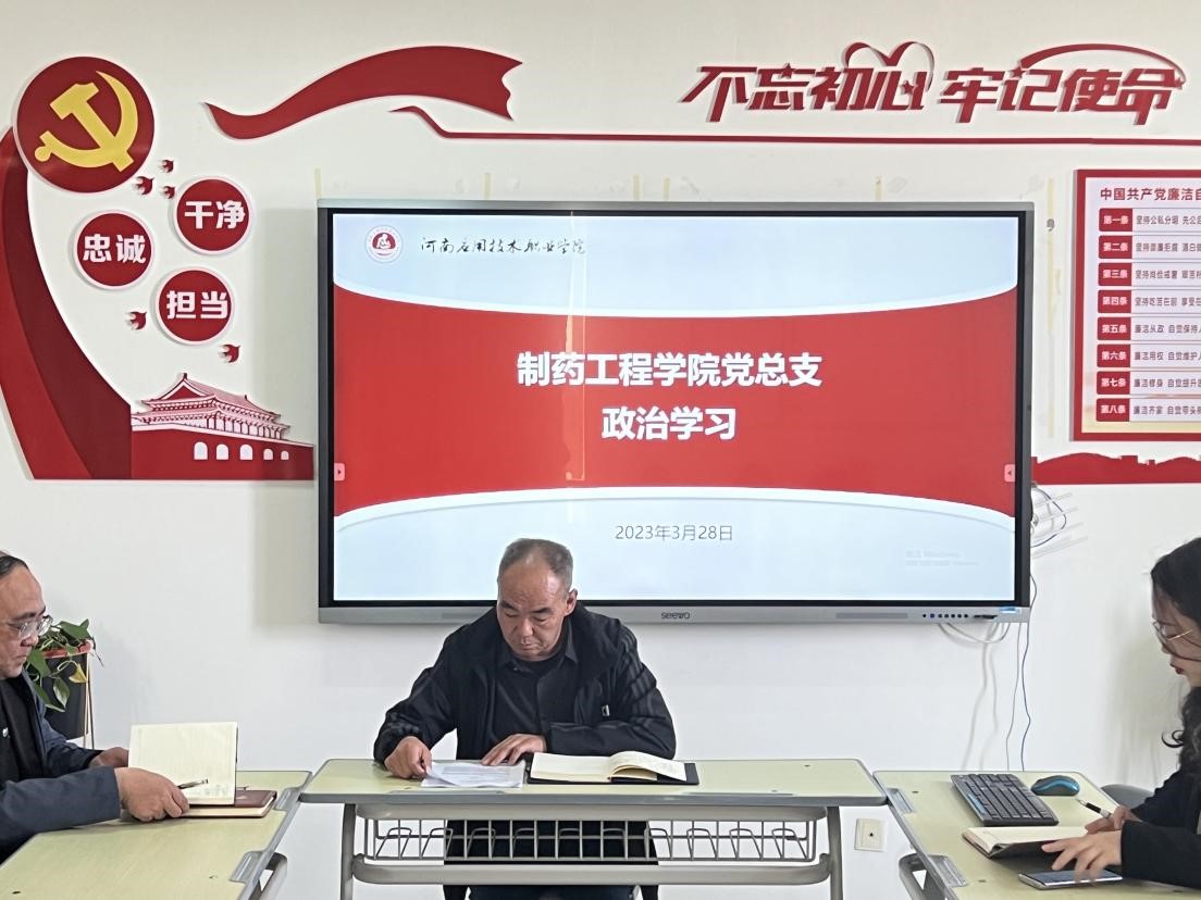 根据学校党委宣传部(统战)部安排,制药工程学院党总支于2023年3月28日下午在501党员活动室开展政治理论学习专题会,会议由学院党总支书记窦传斌主持,全体教职工参加了学习。