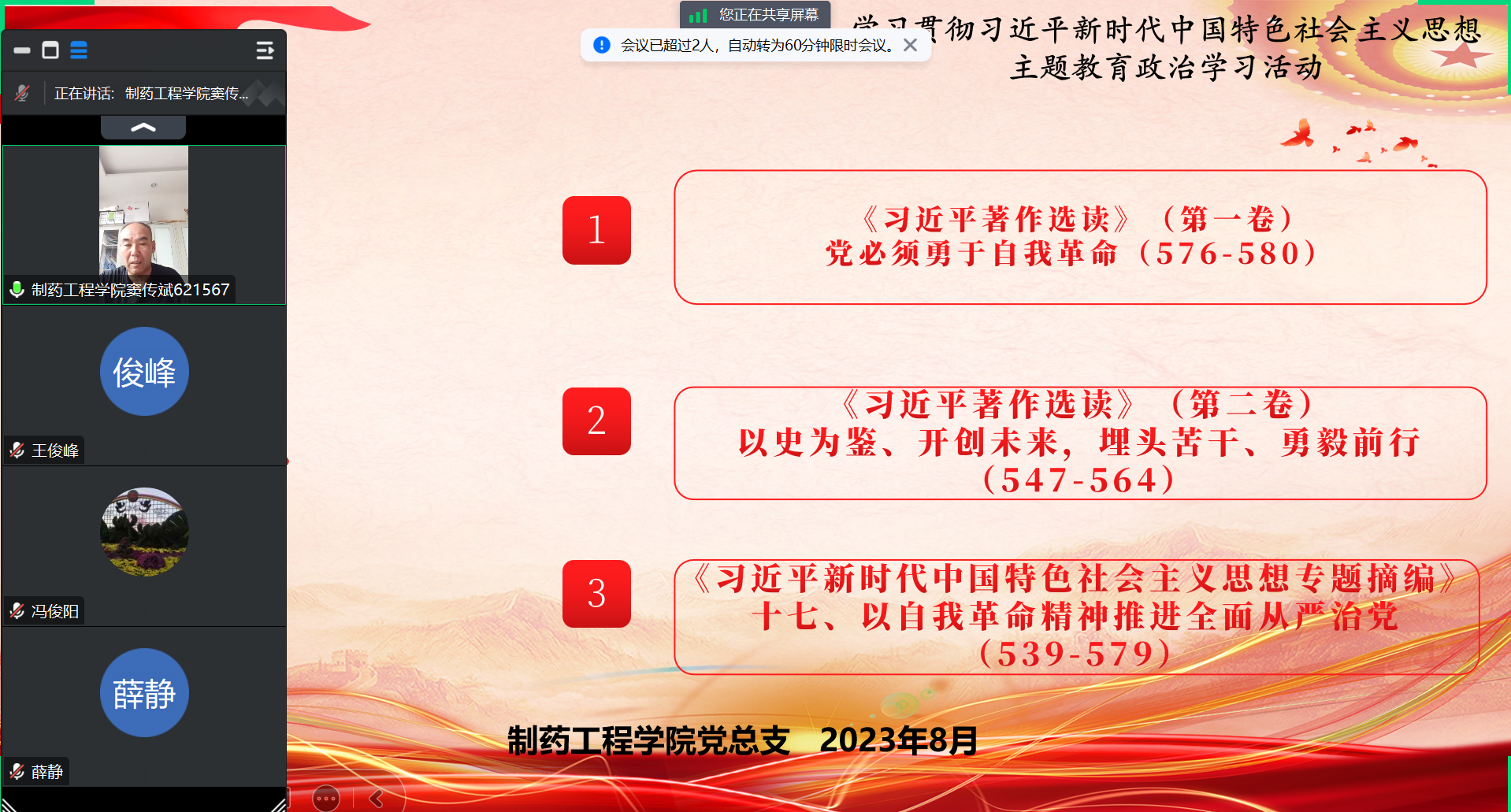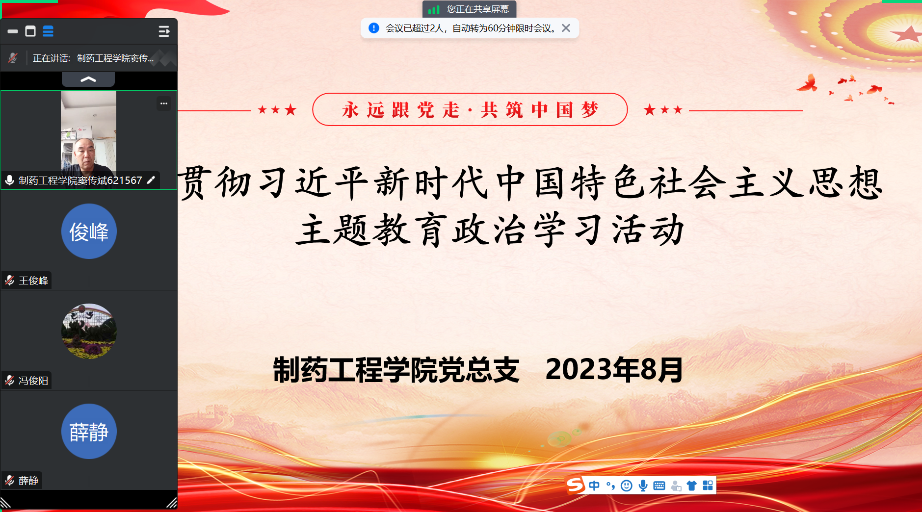 为深入开展学习贯彻习近平新时代中国特色社会主义思想主题教育,不断提高部门人员的政治判断力、政治领悟力、政治执行力,增强思想自觉、政治自觉、行动自觉。根据学校党委宣传部(统战)部安排,制药工程学院党总支于2023年8月7日上午开展政治理论学习专题会,会议由学院党总支书记窦传斌主持,全体教职工线上参加了学习。