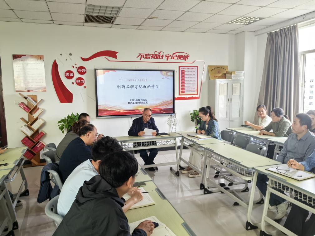 根据学校党委宣传(统战)部安排,制药工程学院党总支于2023年10月17日在501党员活动室开展政治理论学习专题会,会议由学院党总支书记窦传斌主持,学院全体教师参加了学习。