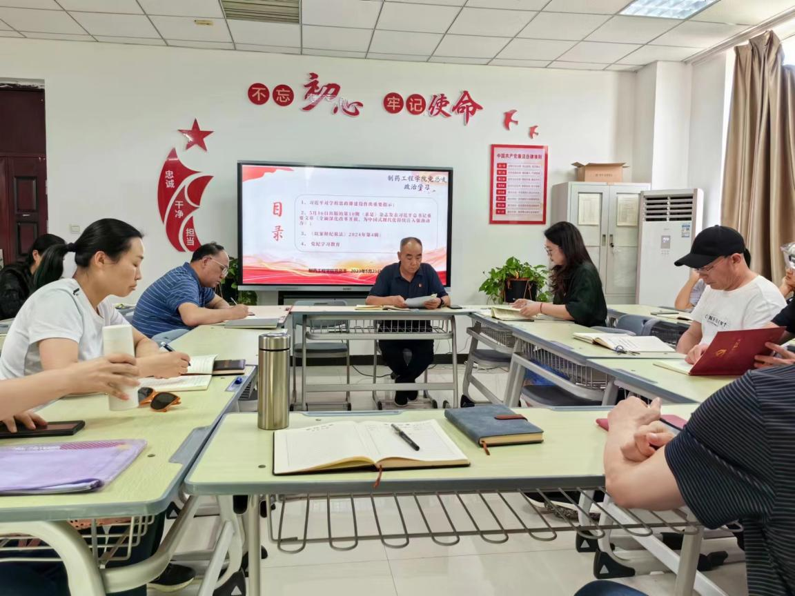 根据学校党委宣传(统战)部安排,制药工程学院党总支于2024年5月21日下午在301党员活动室开展政治理论学习专题会,会议由学院党总支书记窦传斌主持,全体教职工参加学习。