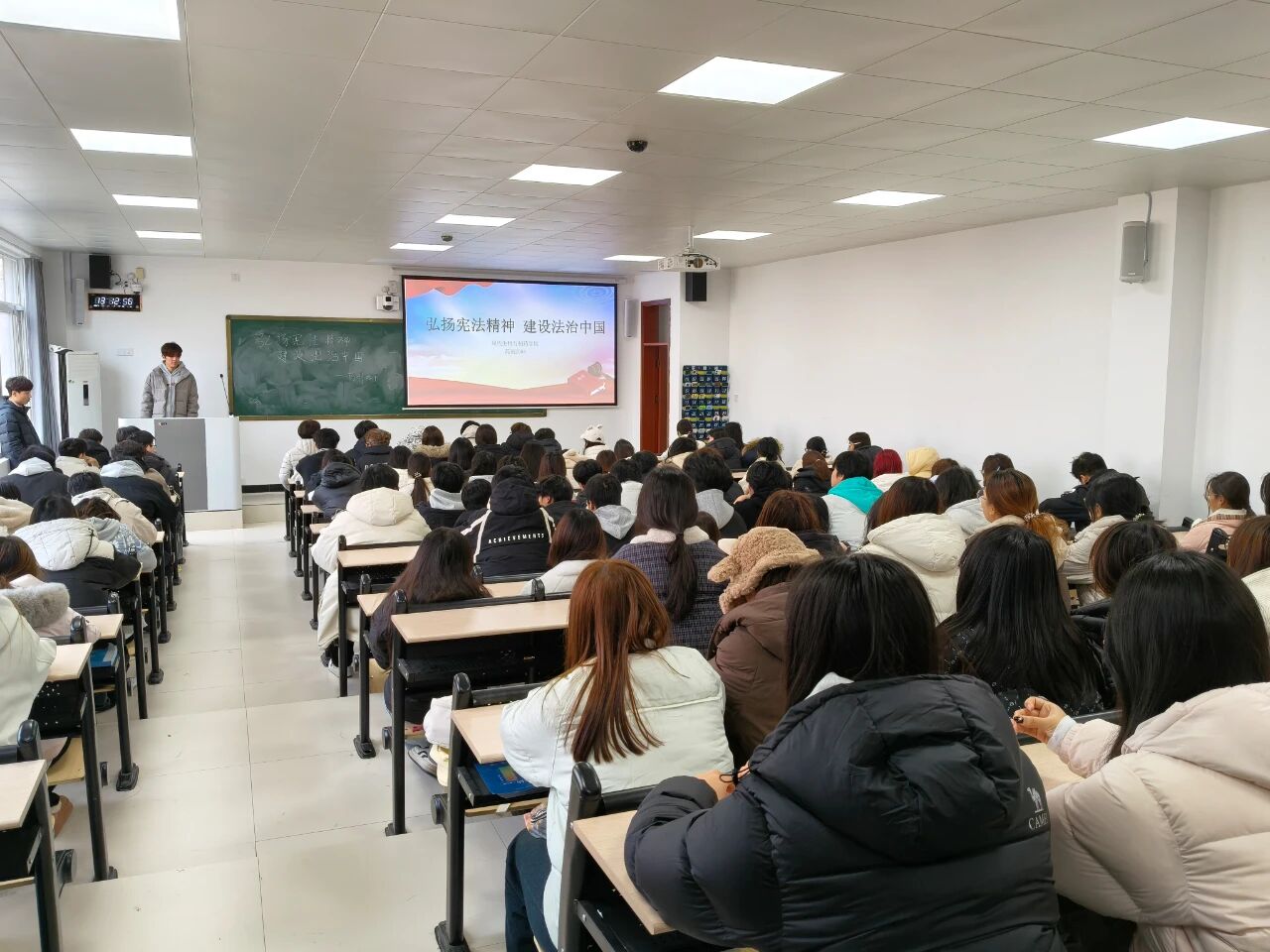 活动中,各团支部团支书通过理论讲解与实例分析相结合的方式,带领同学们系统学习了习近平总书记关于宪法的重要论述,回顾了我国全面依法治国取得的重大成就,深刻阐述了宪法在国家治理中的根本地位与时代意义。在案例研讨环节,同学们结合校园实际展开研讨,解读宪法与公民权利义务之间的紧密联系,现场讨论积极,在观点交流中切实感受到宪法的生命力。