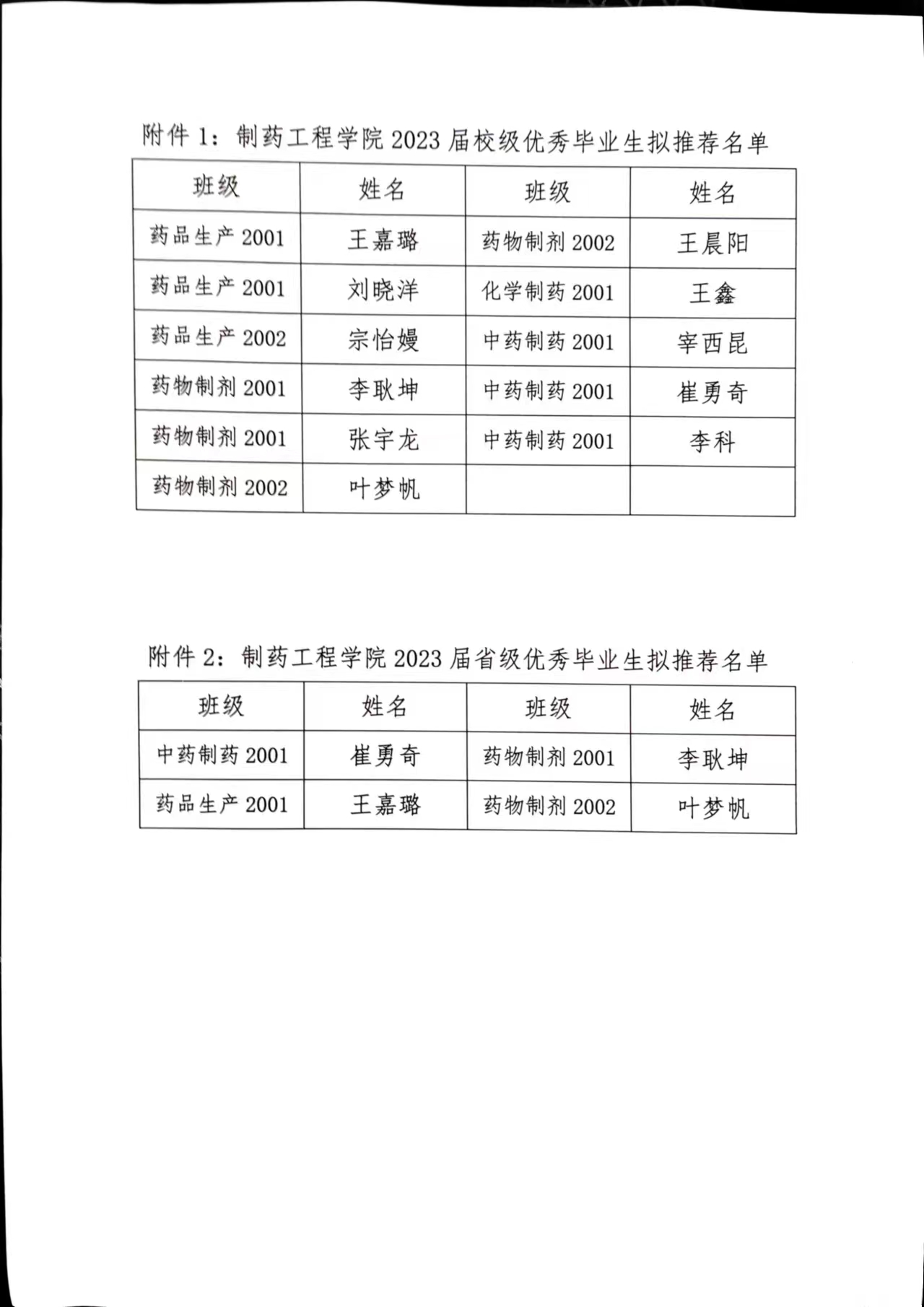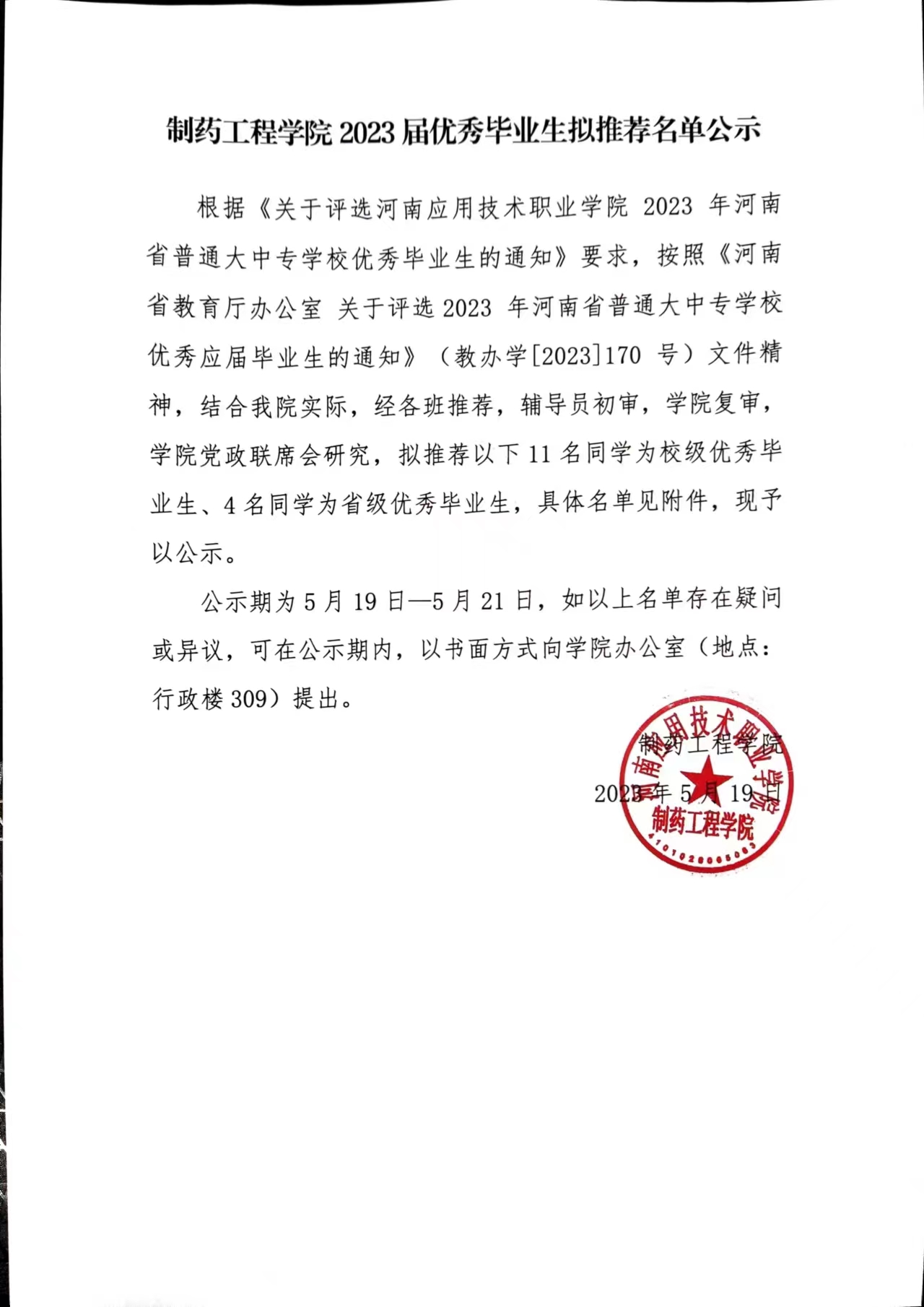 制药工程学院2023届优秀毕业生拟推荐名单公示
