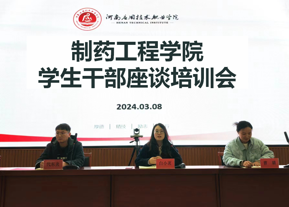 为提高学生干部素质,充分发挥学生干部在群体中的榜样带头作用,加强学院安全建设,更好的开展新学期学生工作,制药工程学院于2024年3月8日下午18:00在办公楼五楼报告厅召开了学生干部代表座谈会。出席本次会议的有党总支副书记白小茗、团总支书记曹璐以及辅导员代东炎,校(院)学生会各部门负责人、以及学院各在校班班长、团支书、宿管委员、心理委员参会。