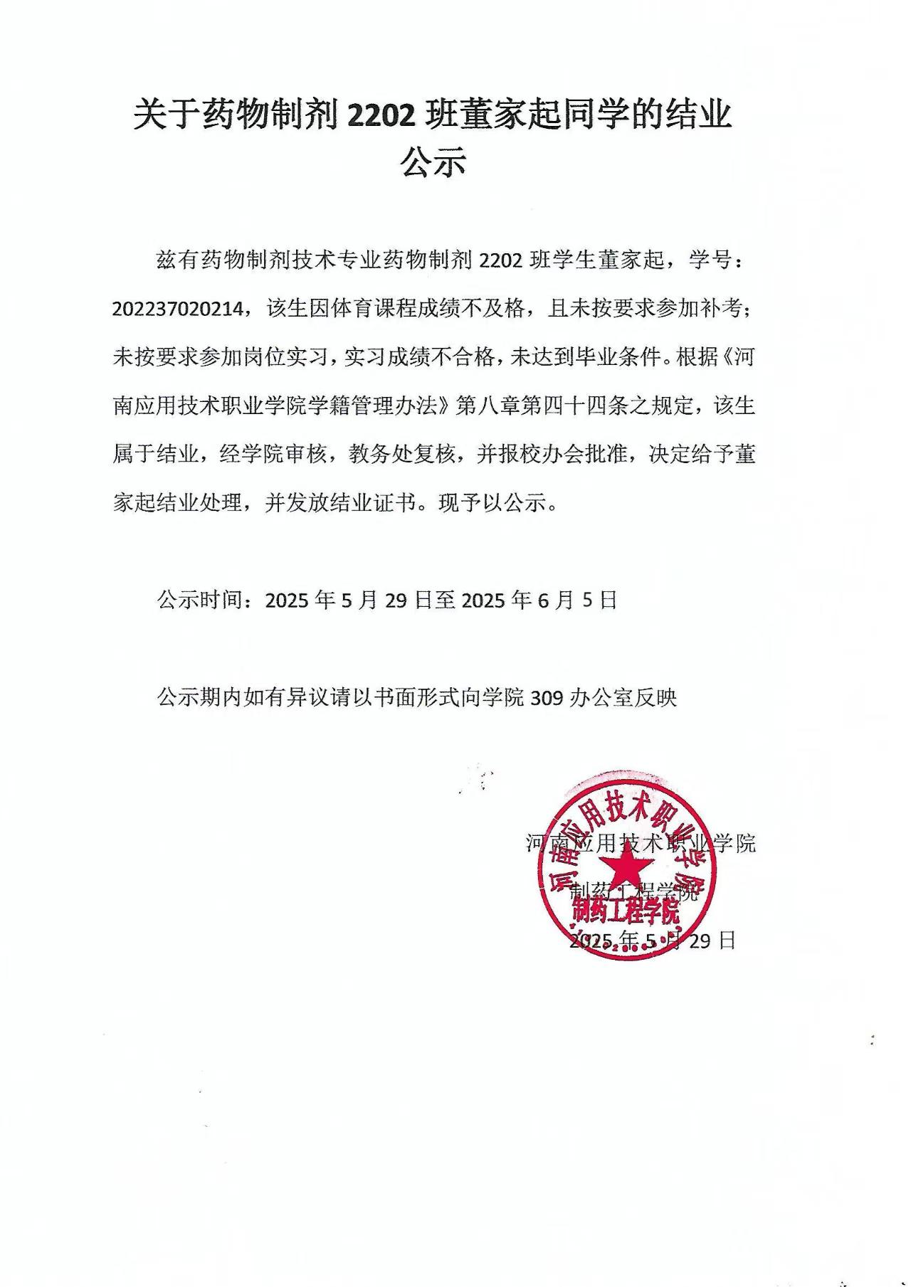 关于药物制剂2202班董家起同学的结业公示