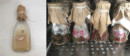 香菇和灵芝的中试试验也在同时进行中,已经完成了栽培料的接种,项目小组尝试了香菇的菌袋栽培和菌床栽培以及灵芝的盆景栽培等多种形式,预计一个月后待菌丝长满即可进入子实体生长阶段。