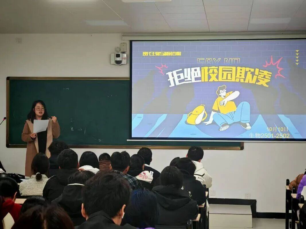 主题班会上,各班辅导员结合校园欺凌典型案例,从“校园欺凌的表现形式”“欺凌行为的法律边界”“遭遇欺凌时的应对方法”三方面展开讲解。通过真实案例剖析,让同学们深刻认识到言语侮辱、肢体冲突等欺凌行为对受害者身心的双重伤害,也明确了“不做欺凌者、不做旁观者”的行为准则。引导学生思考“学习中的互助精神如何助力抵制欺凌”,鼓励大家以友善包容的态度与同学相处,用知识共享、实验互助等行动传递温暖。